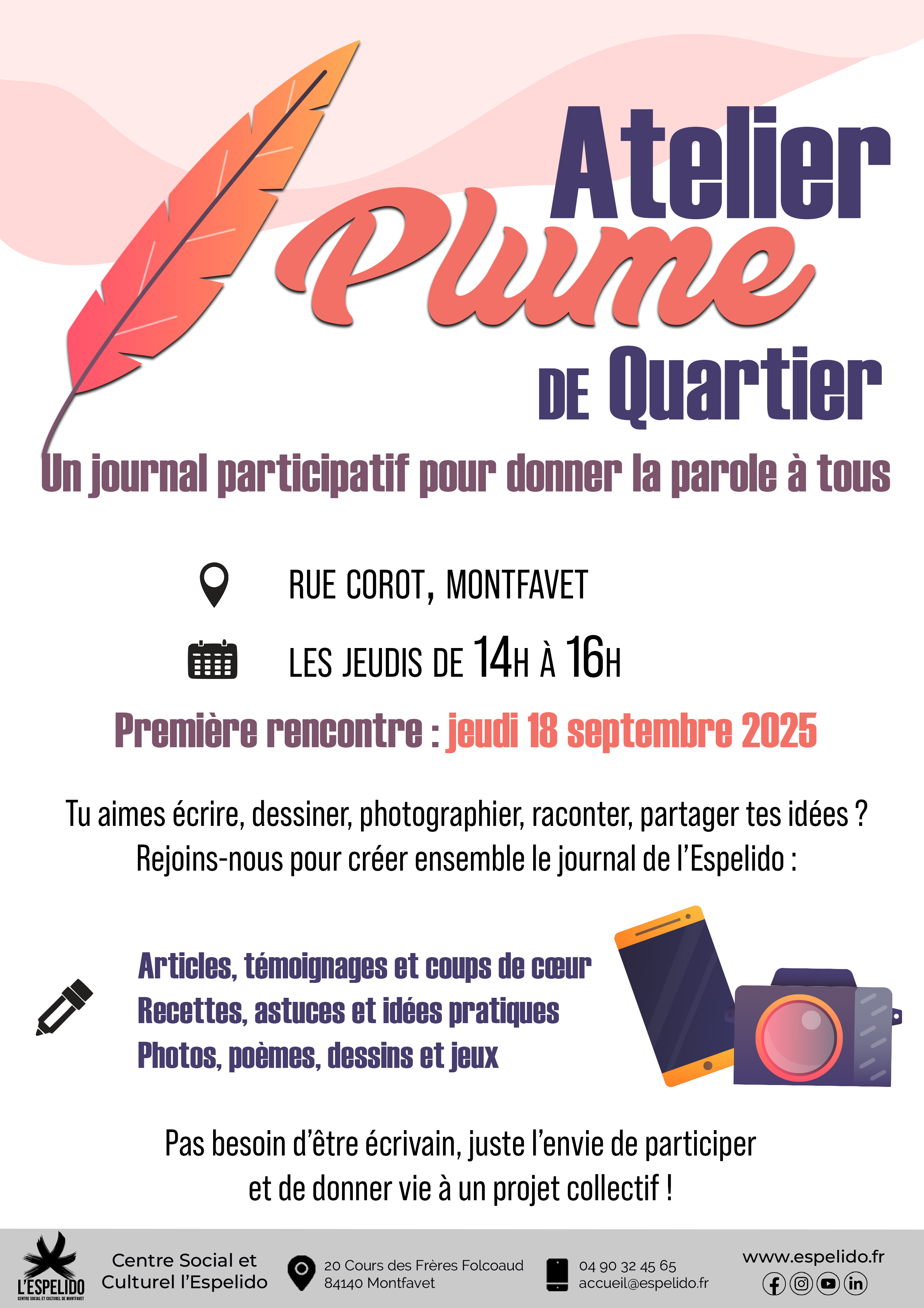 Que vous aimiez écrire, dessiner, photographier, raconter ou partager vos idées, cet atelier est fait pour vous. Ensemble, nous donnerons vie à un journal qui reflète la créativité de chacun : articles, témoignages, coups de cœur, recettes, astuces, photos, poèmes, dessins et jeux… tout ce qui vous inspire y trouvera sa place !