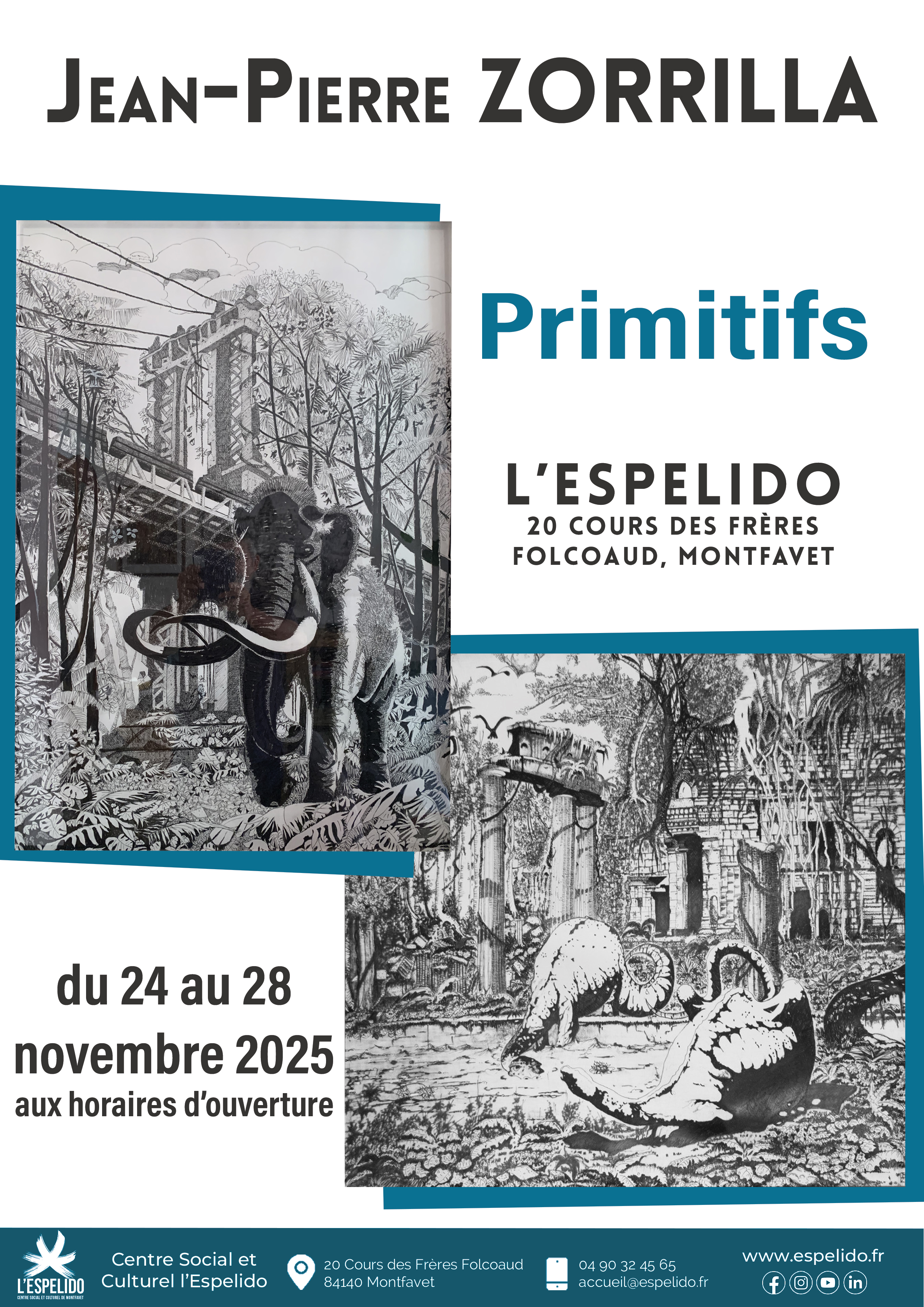 L’Espelido a le plaisir de vous inviter au vernissage de l’exposition “Primitifs” de Jean-Pierre Zorrilla, le mardi 25 novembre à 17h30 au siège, 20 cours des Frères Folcoaud à Montfavet.
